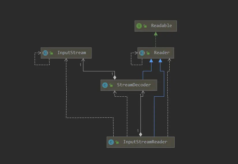InputStreamReader继承了Reader接口,但是新建对象时,还需要在构造器中传入一个InputStream的实例对象,InputStreamReader的作用也就是将InputStream匹配到Reader中,结构如下所示: