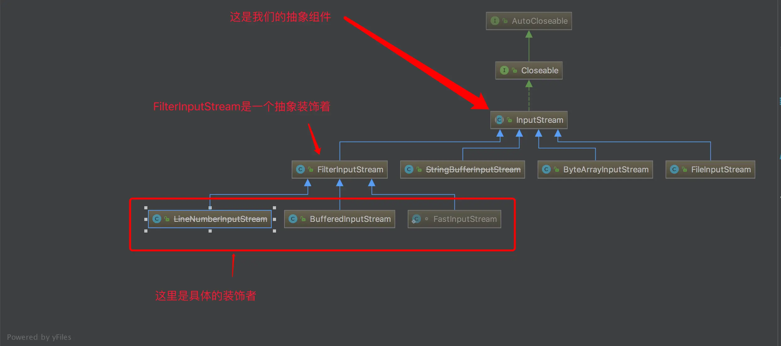 其中InputStream类是以抽象组件存在的,而FilterInputStream就是具体组件,它实现了组件的所有接口,并且持有InputStream的对象实例的引用;而BufferedInputStream是具体的装饰器实现,它给原有的类附加了功能。
