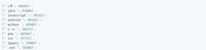 程序员当然要爬一下stackoverflow。爬取stackoverflow前20000页,每页将问题数量设置为50,共1m条数据。可以根据所有问题的标签提取出Top10的关键词,也能看到Python类的问答票数前10的问题: