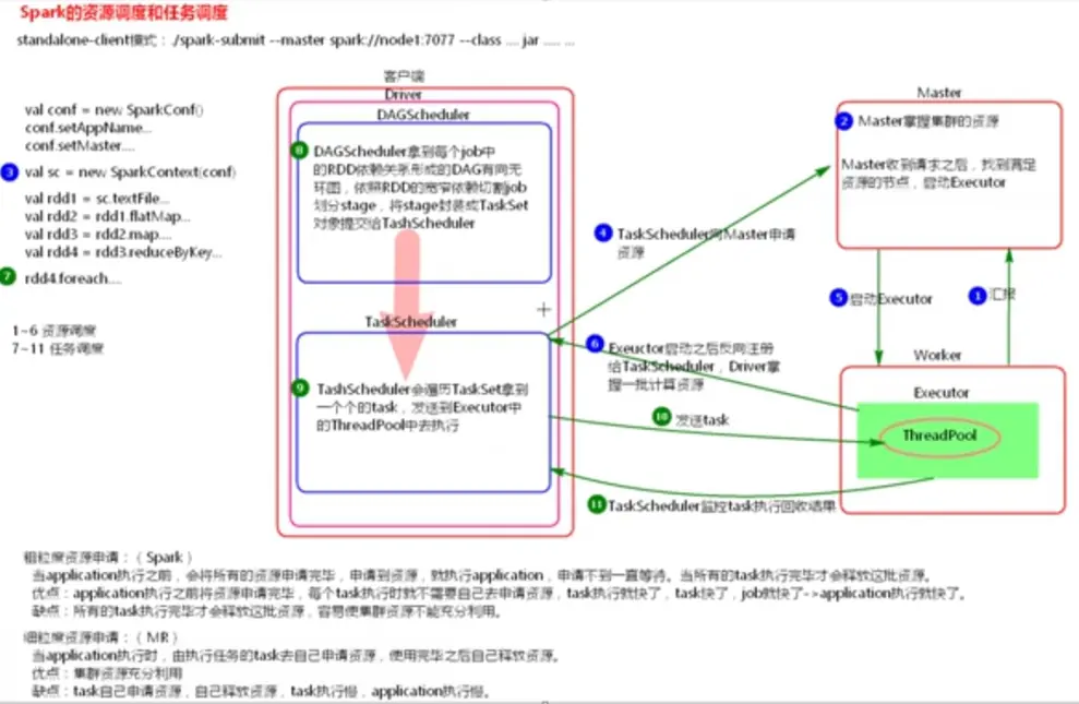 - 1.启动集群,Worker向Master汇报资源,Master掌握了集群资源