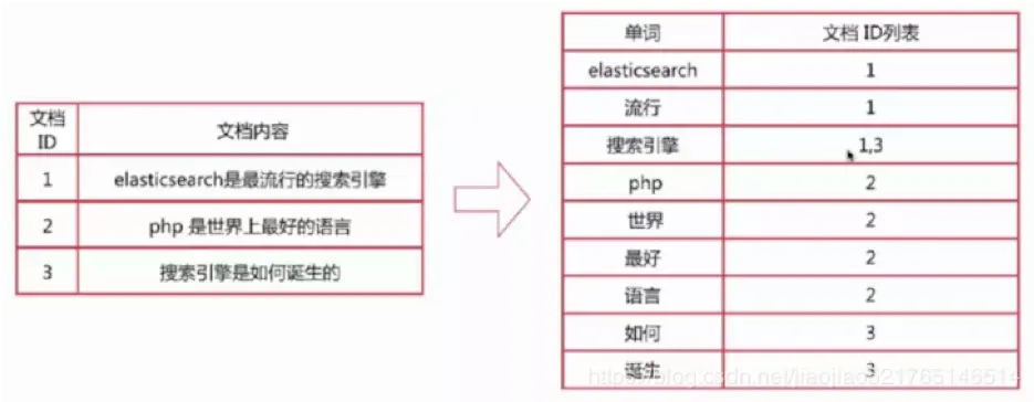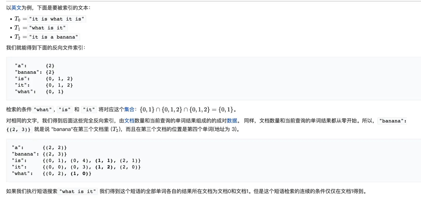 在ES2.0版本中,文档的存储是基于倒排索引实现的,在后面的5.0+有所改进,先简单看下什么是倒排索引,以下示例摘自维基百科:
