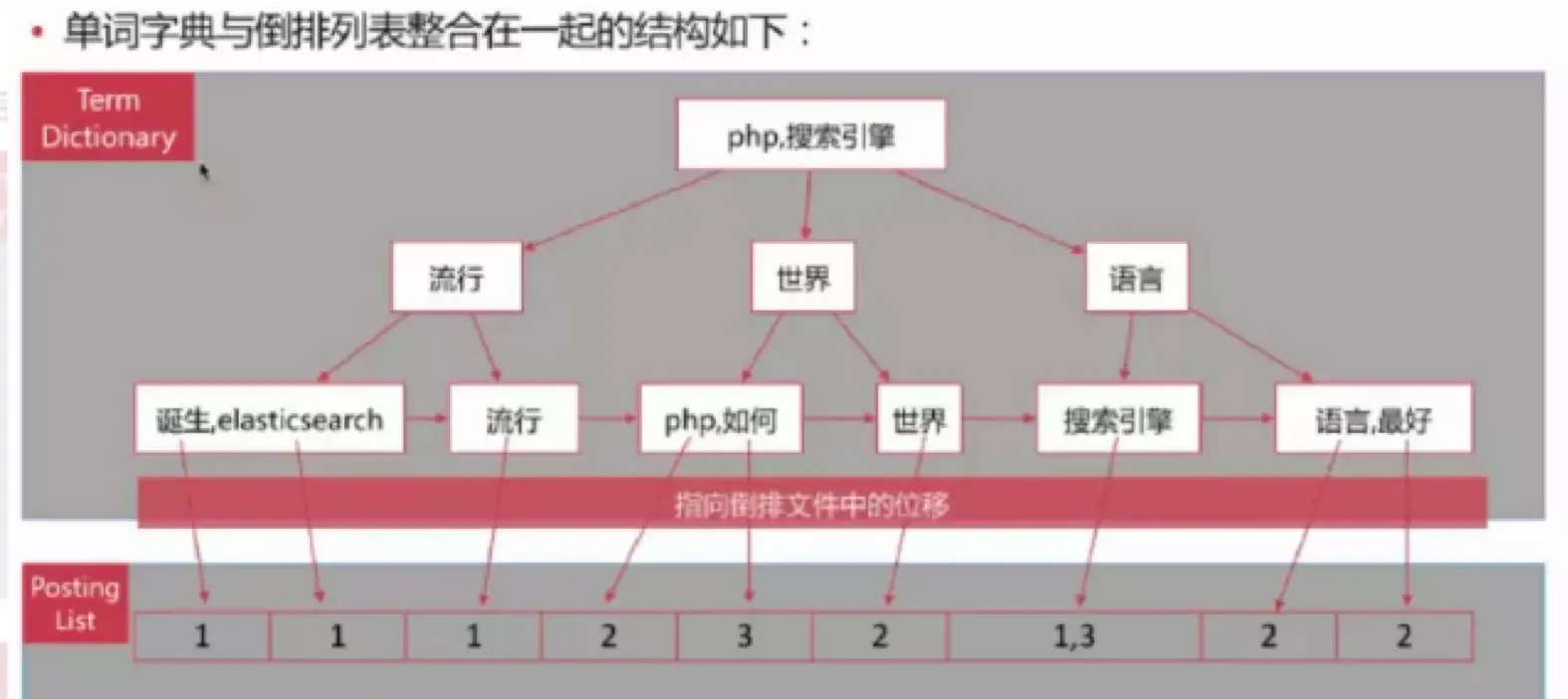 倒排索引由两部分组成,参考上图:一部分为词典,即我们看到的B+Tree,另外一部分为倒排列表,即每个分词对应索引的 Posting List