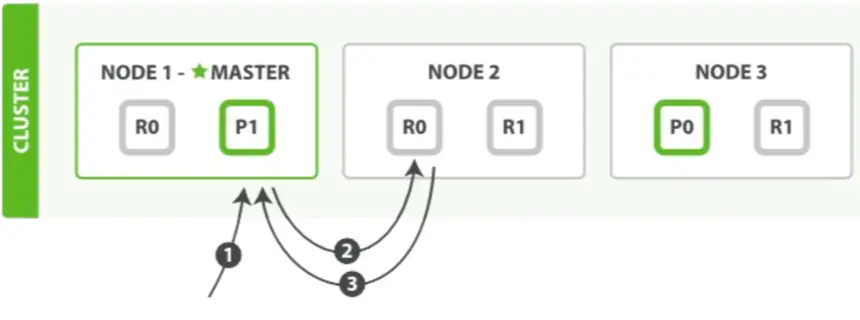 3、扩容到三个节点:为了分散负载会进行重新分配,每个节点拥有2个分片,分配策略有点类似MySQL中的 RAID10,此处不做深入解释。