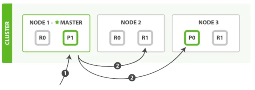 2、扩容到两个节点:副本分片将会对应分布到新增的节点上。