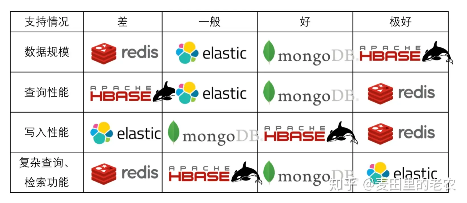 说到NoSQL,redis、MongoDB也是呀,说到大数据存储,HBase也可以呀,那么如何取舍呢?借用一张其它博客的图: