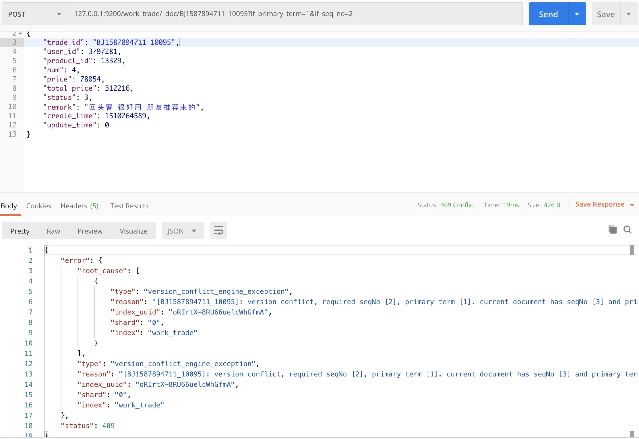 下面示例可以较清晰的看出:_seq_no不一致ES会直接返回更新失败及详细报错信息。