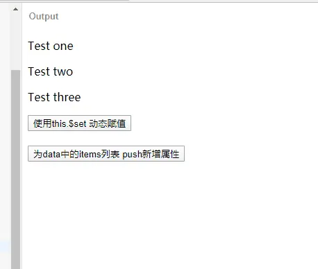<button class="btn" @click="btn2Click()">使用this.$set 动态赋值</button><br/><br/>