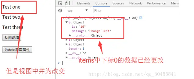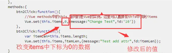 这里得警惕一种情况: 当写惯了JS之后,有可能我会想改数组中某个下标的中的数据我直接**this.items[XX]**就改了,如: