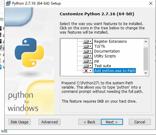 - 安装Python时候,只能安装2.×的版本,注意勾选安装界面上的Add Python to path中的第二个,这样才能自动将Python安装到系统环境变量中;