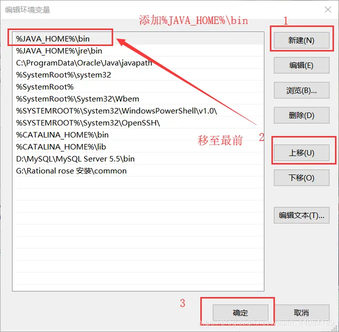 点击新建,变量值为%JAVA_HOME%\bin ,并将它移到最前端,然后点击确定。