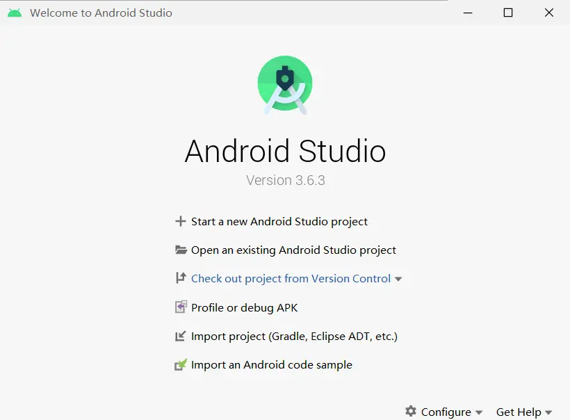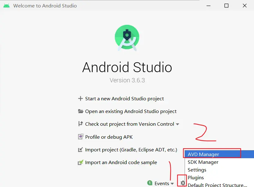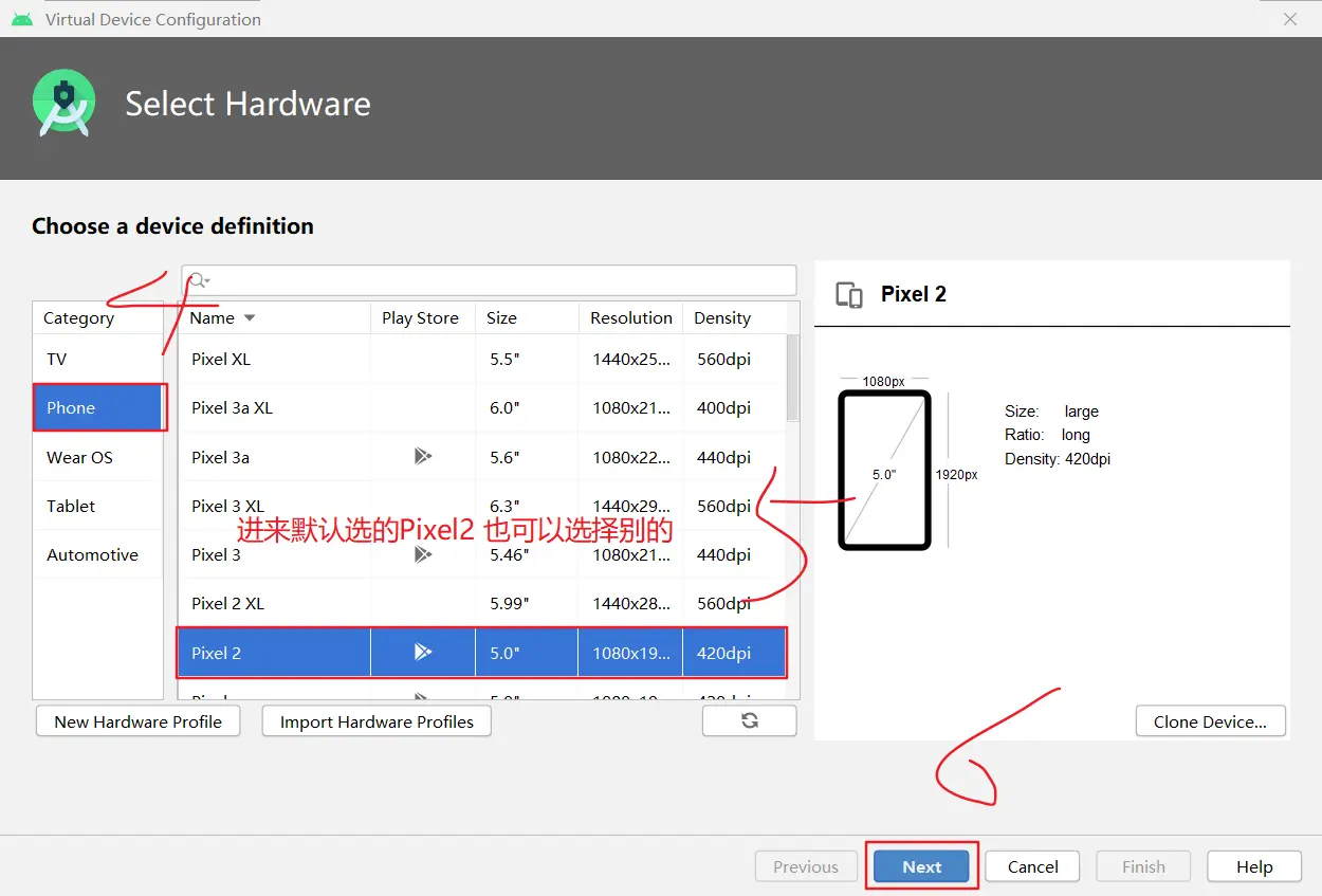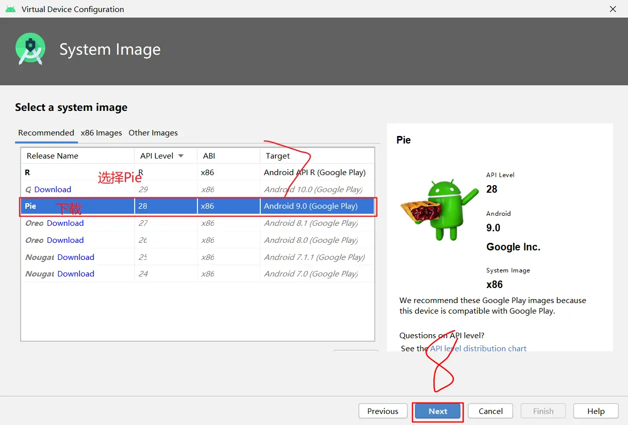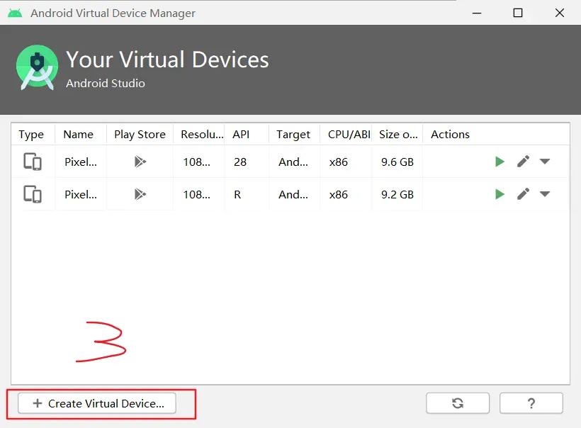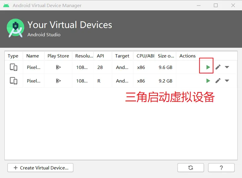 如果你刚刚才安装 Android Studio,那么可能需要先创建一个虚拟设备。点击"Create Virtual Device...",然后选择所需的设备类型并点击"Next",然后选择Pie API Level 28 image.