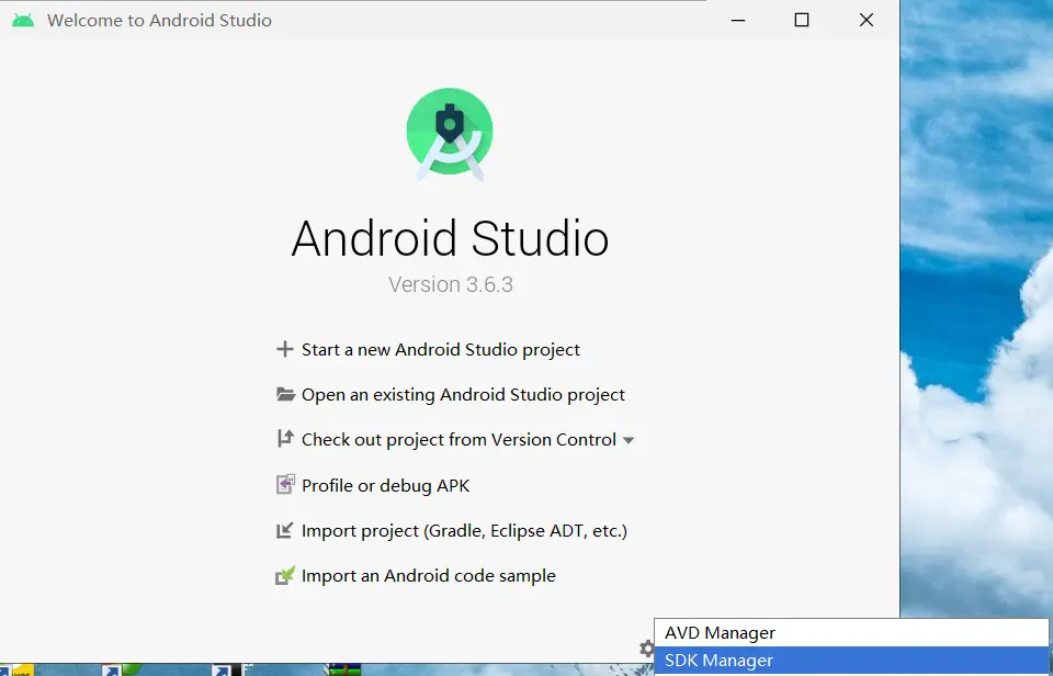 你可以在 Android Studio 的欢迎界面中找到 SDK Manager。点击"Configure",然后就能看到"SDK Manager"。