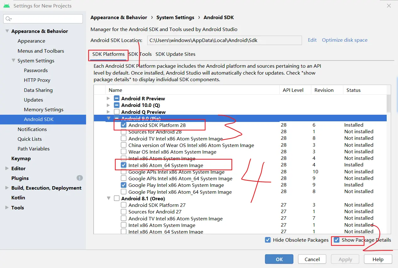 在 SDK Manager 中选择"SDK Platforms"选项卡,然后在右下角勾选"Show Package Details"。展开Android 9(Pie)选项,确保勾选了下面这些组件(重申你必须使用稳定的翻墙工具,否则可能都看不到这个界面):