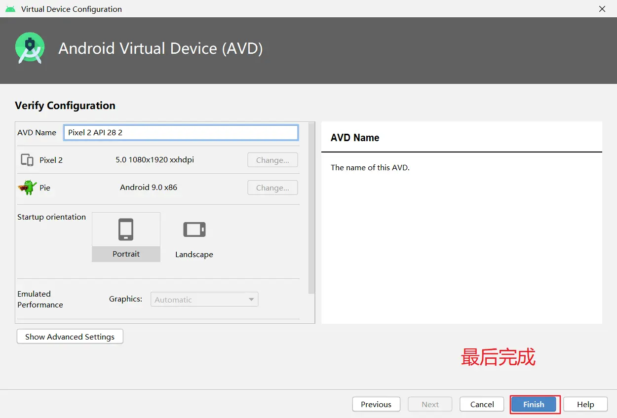 然后点击"Next"和"Finish"来完成虚拟设备的创建。现在你应该可以点击虚拟设备旁的绿色三角按钮来启动它了,启动完后我们可以尝试运行应用。 1