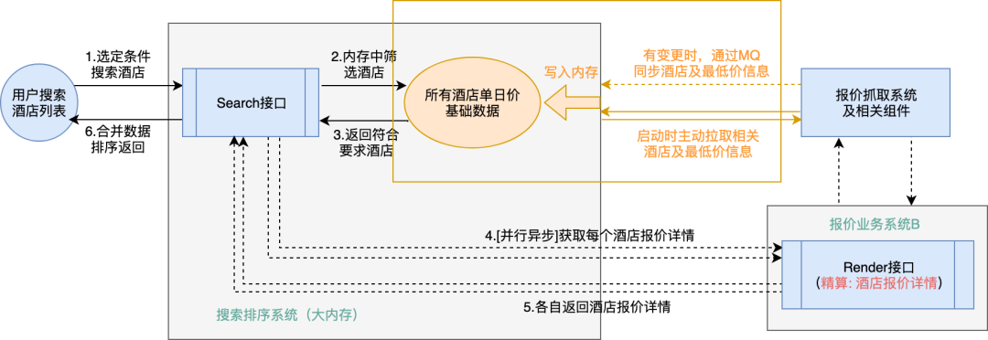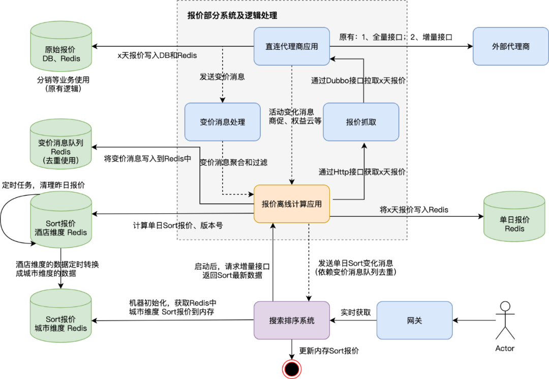 为了完成上图中橙色部分的数据处理和逻辑调整,我们复用了之前酒店分销业务已经落地的报价数据,通过增加处理变价消息等手段,将相关数据存储到相关的Redis里去适配本次架构调整,并且将报价数据以消息的方式同步到上游搜索排序系统。搜索排序相关的服务器在启动时主动拉取相关数据到内存中,并且处理相关的变化消息来保证内存中数据是最新的。这里实际调整很大,涉及的逻辑也比较复杂,具体可参考下图: