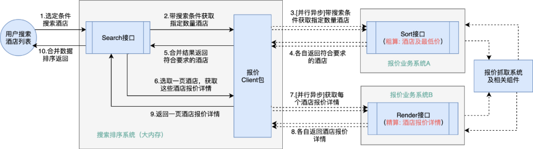 接下来具体介绍一下这个应用提供的核心接口:Sort接口。这个接口主要完成的就是对用户搜索酒店列表时的“粗排”,具体来说,是根据城市等参数返回满足条件的酒店排序,同时返回最低价等一些报价信息。这个“粗排”完成之后,上游的搜索排序系统结合一些特征因素选择出需要展示的部分酒店,继续调用其他应用的Render接口完成对指定酒店的“精算”,这时会得到实际的酒店最低价及参加的活动、优惠等详细报价信息。总结一下,Sort接口完成的是酒店的筛选及基础的排序,最终每个酒店的报价详细信息是来自于其他应用的Render接口完成。