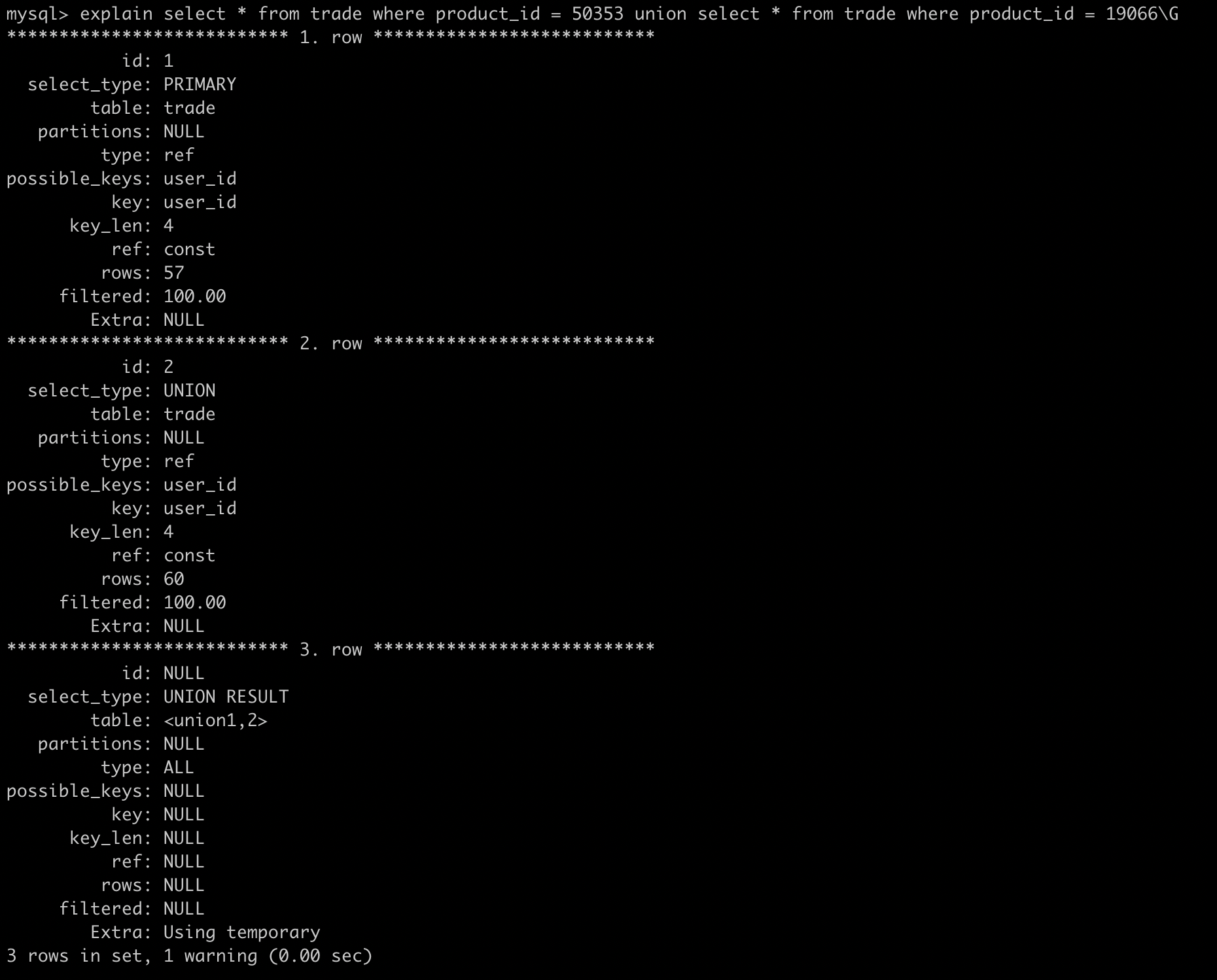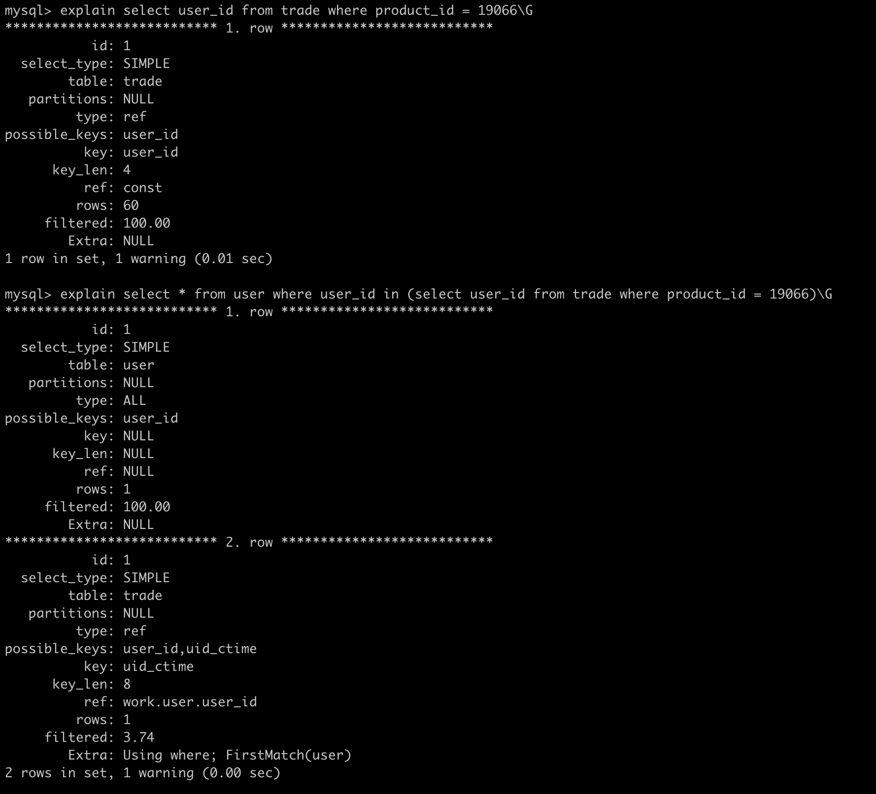 EXISTS(select * from trade where product_id = 19066 and trade.user_id = user.user_id);如果外层是个很大的表,那么这个查询的性能将会变得很糟糕。当然我们也可以进行一些优化,利用GROUP_CONCAT函数构造一个逗号拼接的字符串,或者用 inner join 进行连接。