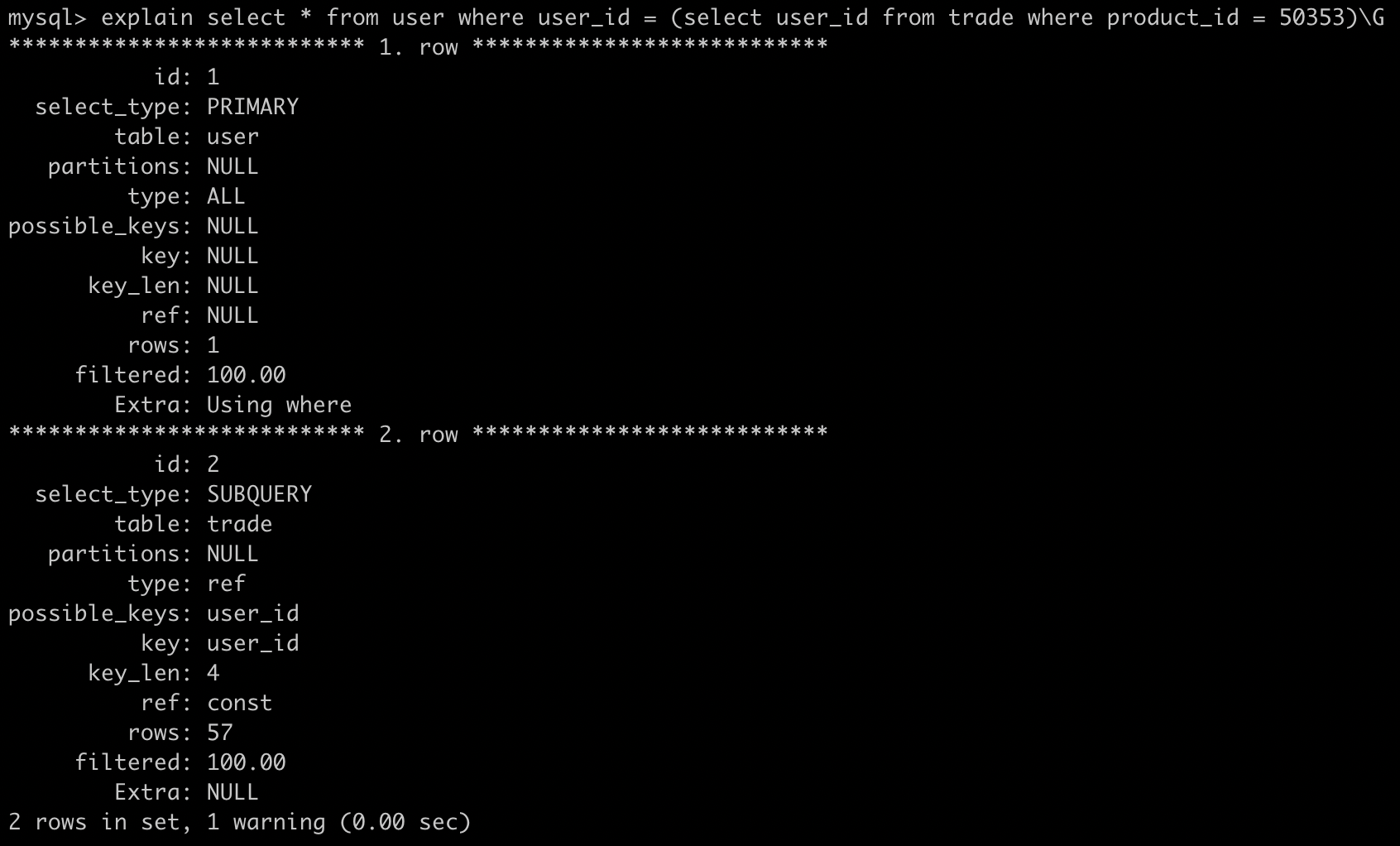 上面这个case还是很奇怪的,我们发现uid_ctime索引不对呀,我们的子查询是product=,怎么会命中uid_ctime的索引呢?接下来我们讲一下MySQL的子查询