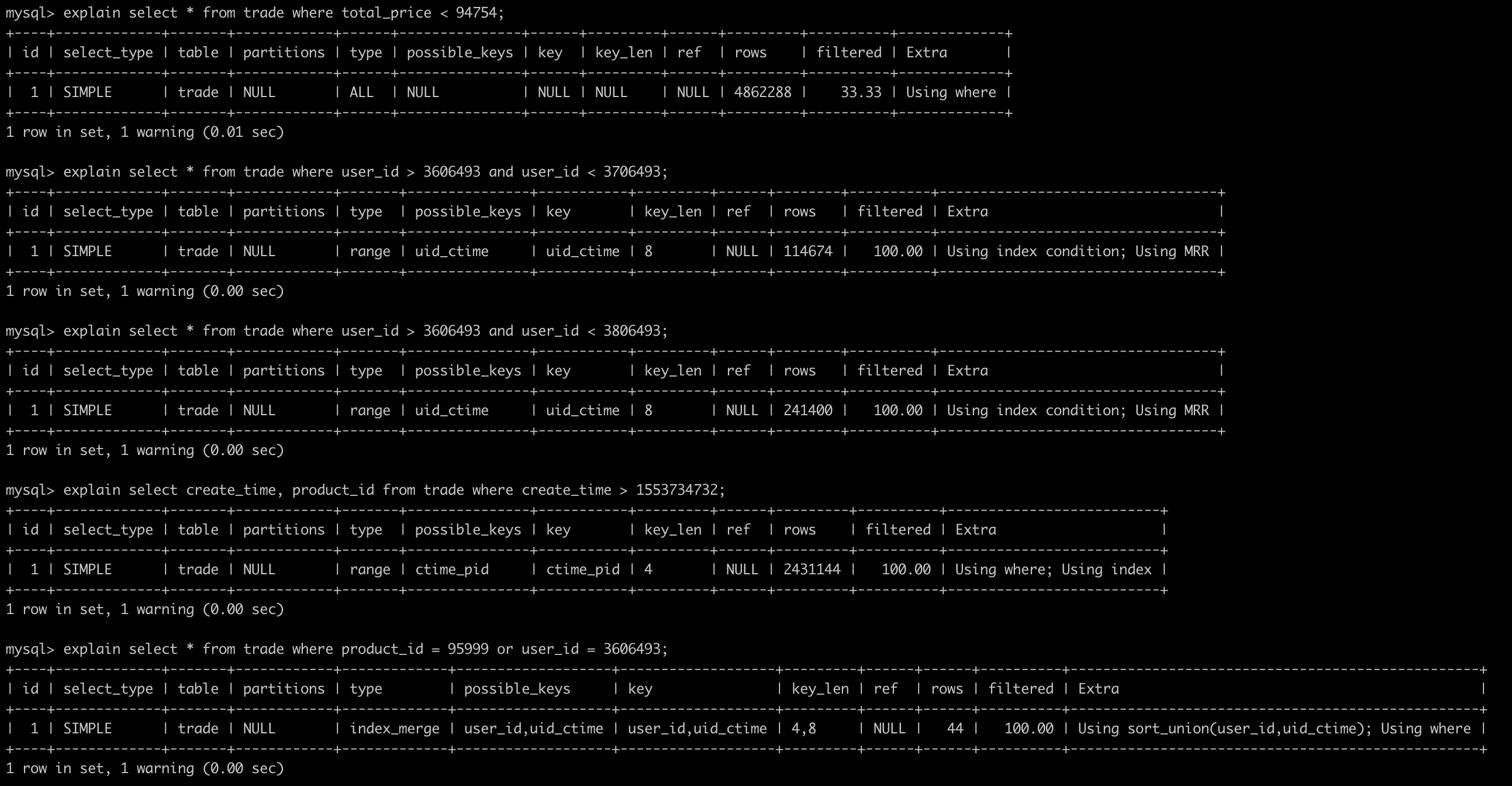 假设有如下表,trade 预先灌表500W+数据(也可以用MySQL的函数写随机数,但是比较慢)