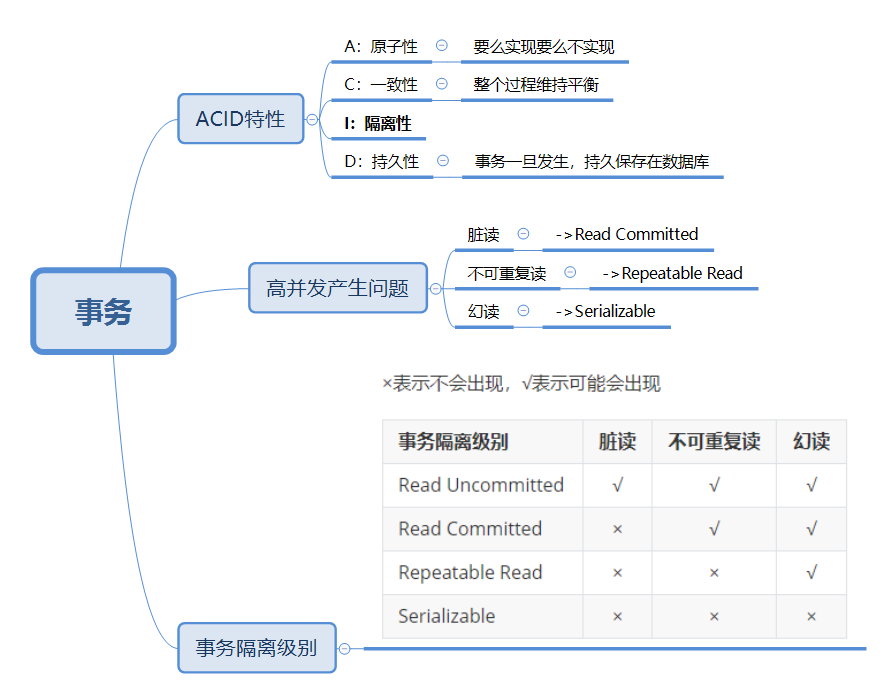 | 事务隔离级别 | 脏读 | 不可重复读 | 幻读 |