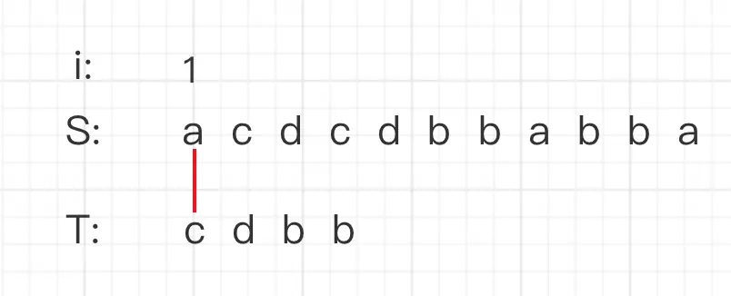位置i = 1 时,S[1] != T[1], T 后移一位,从S[2]再开始匹配