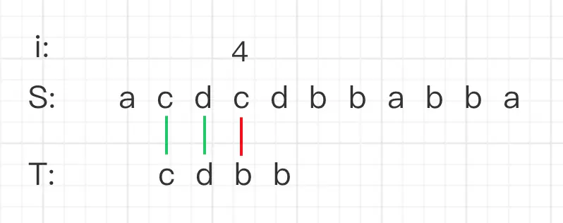 - S[4] != T[3], 说明从S[2]开始后面T个长度的"cdcd"不是匹配的结果 , T再次后移,从比较S[3]开始匹配