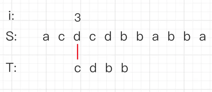 假设有两串 S [ abbacdbbbba ] T [ cdbb ]