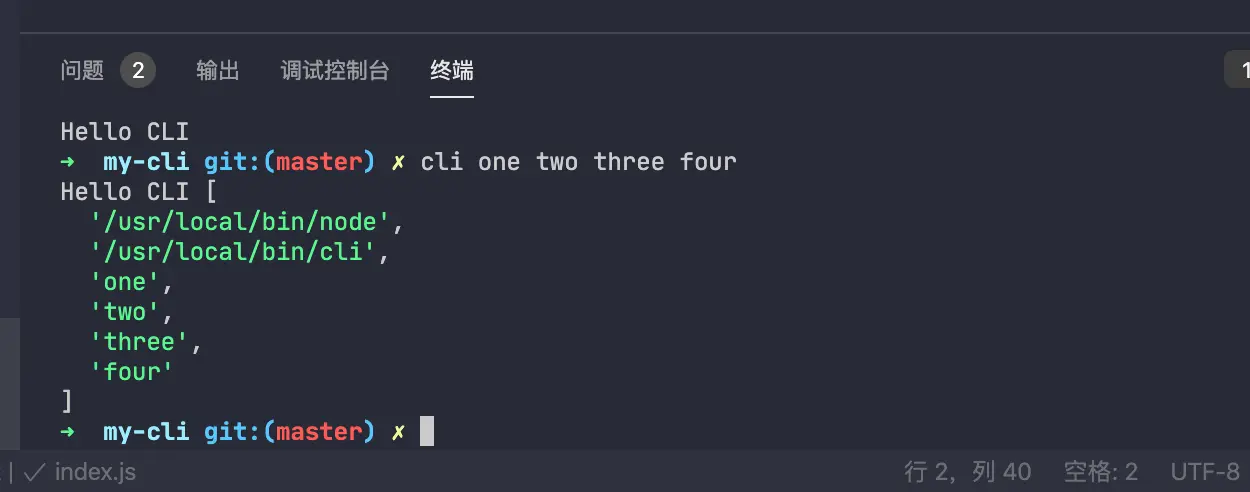 数组中的前两个元素是 node 和 cli 命令的路径。(对于Windows系统,它可能会打印出不同的输出)输出可能会因您的计算机设置和环境而异(这取决于您在计算机上安装node和cli命令的位置)。