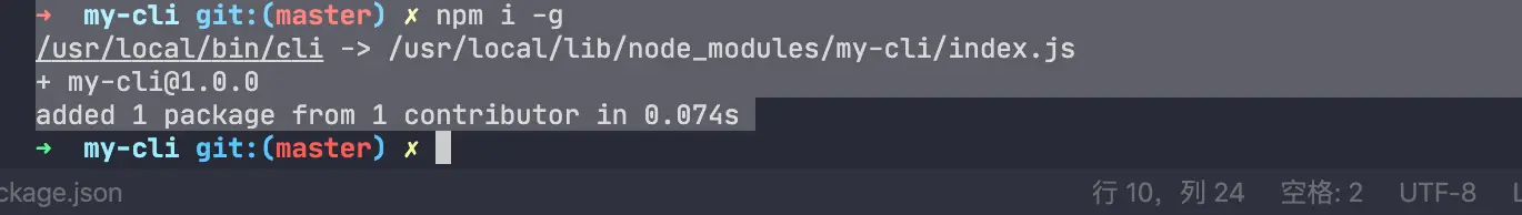 最后,让我们运行CLI在控制台上打印Hello CLI。通过运行 npm i -g 在package.json中安装配置。