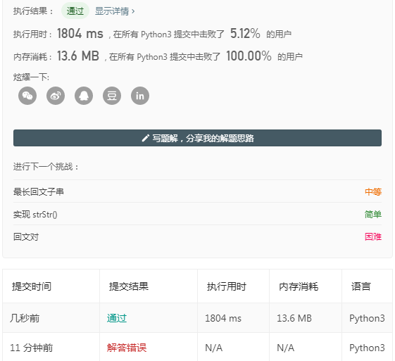 [Python]LeetCode 214. 最短回文串 023 2020-04-22 519 阅读1分钟 难度:简单 原文:leetcode-cn.com/problems/sh… 题目 给定一个字符串 s,你可以通过在字符串前面添加字符将其转换为回文串。找到并返回可以用这种方式转换的最短回文串。 示例 1: 输入: "aacecaaa" 输出: "aaacecaaa" 示例 2: 输入: "abcd" 输出: "dcbabcd" 思路1 1. 回文串的定义是自己等于自己的倒过来,str=str[::-1] 2. 一个str+倒过来的str[::-1]肯定是回文了,但这样是冗余的 3. 一个str如果拼接上最后一个字符如果是回文串那就是最小的了 4. 如果不行就再+倒数第二个,依次类推,直到加到完整的倒过来的字符串-1(最差情况,去头) 示例代码 class Solution: def shortestPalindrome(self, s: str) -> str: if s==s[::-1]: return s else: for index_reverse_str in range(1,len(s)): if (s[::-1][:index_reverse_str]+s)[::-1]==(s[::-1][:index_reverse_str]+s): return s[::-1][:index_reverse_str]+s 执行结果:不如意,内存消耗非常好,有空看看人家的解法,启发下。 那次错误的提交记录是因为漏了s=s[::-1]的情况处理,我不是一个合格的测试人员啊,这种情况竟然没想到。哈哈~不过LeetCode是有很多的坑,踩踩就习惯了。