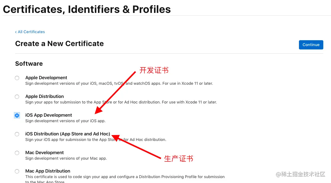 注意:一般我们需要两种证书,一种供开发测试时使用,还有一种是发布生产上传到appstore使用的;