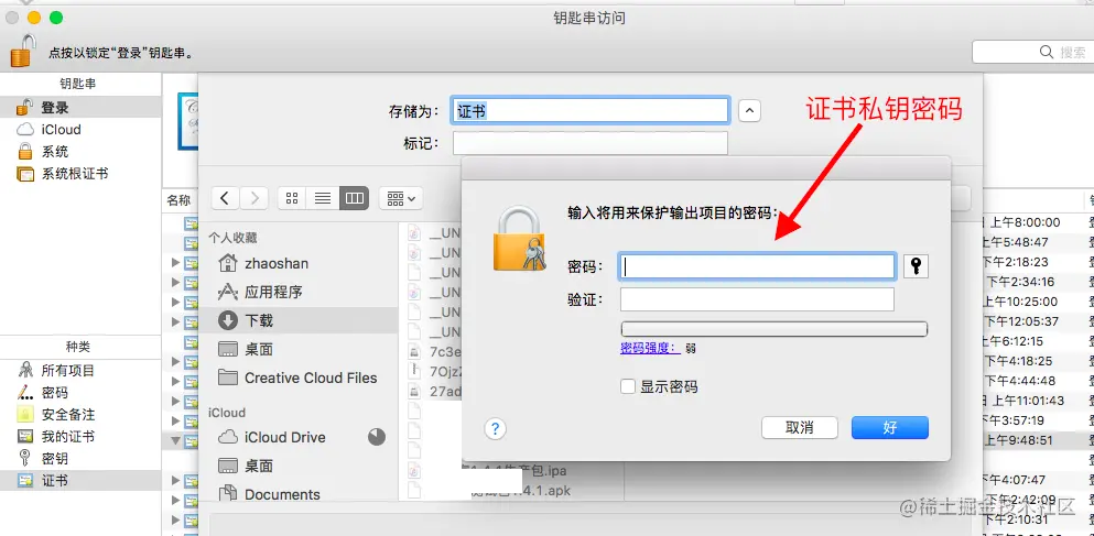 3.9 导出前需要设置证书私钥密码,这个密码要记住,打包时需要
