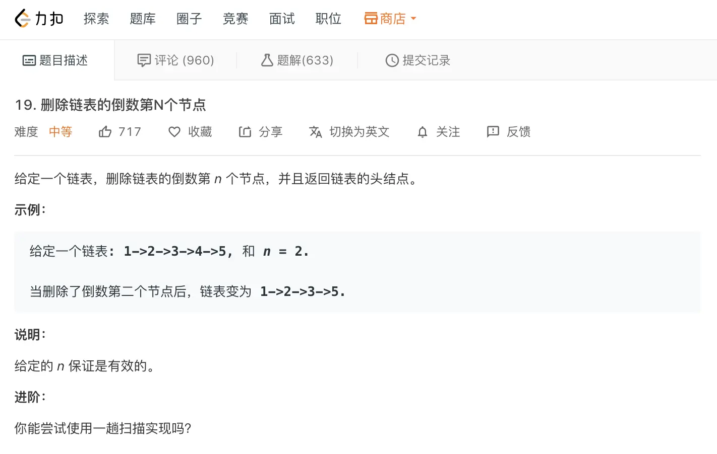题目的进阶要求只使用一趟扫描, 利用快慢指针可实现