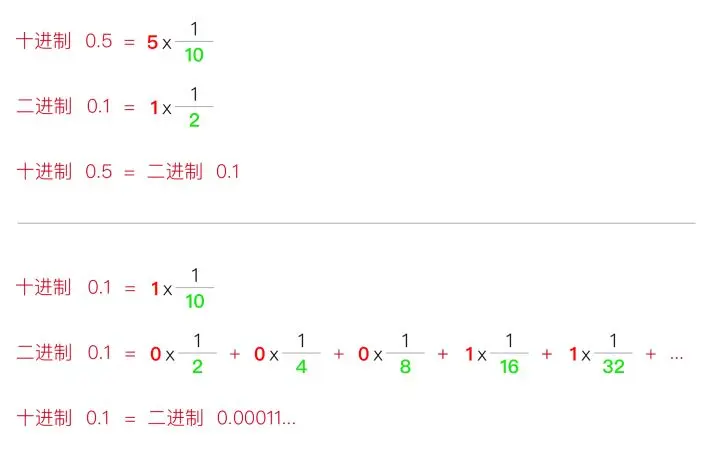 如果看不懂也可以直接看结论:十进制的 0.1 转为二进制,得到一个无限循环小数:0.00011…。
