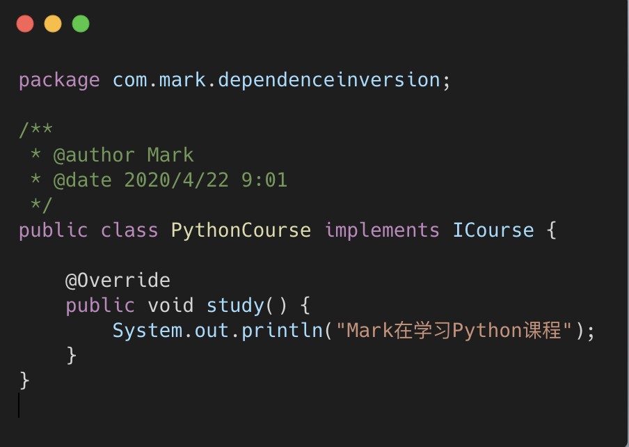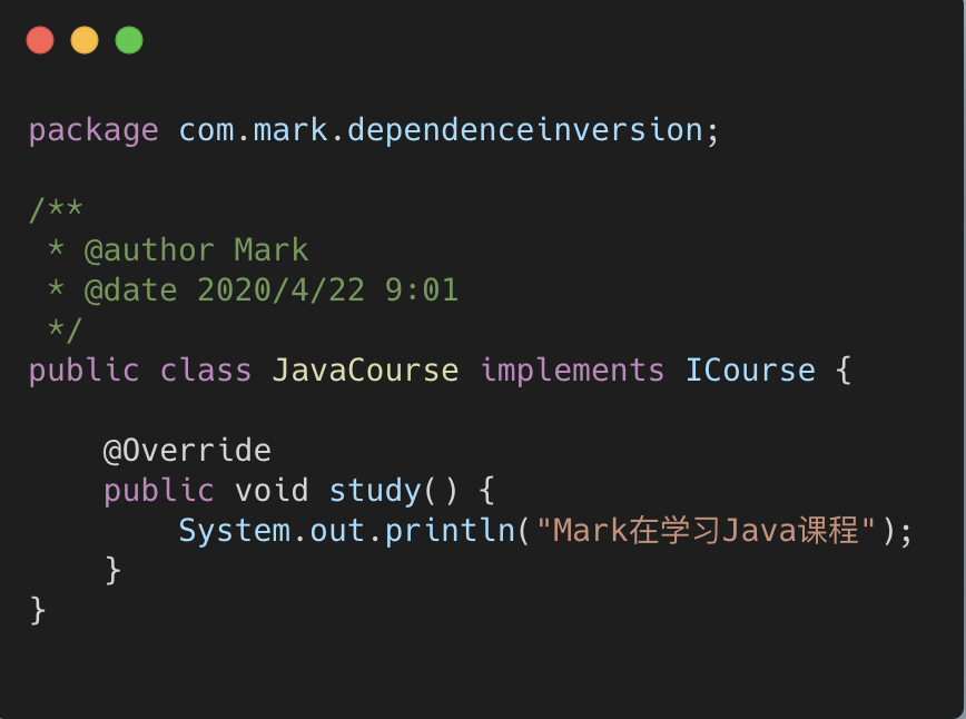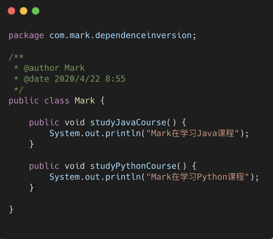 3.Mark热爱学习,目前正在学习 Java 课程和 Python 课程。大家都知道,学习也是会上瘾的。随着 学习兴趣的暴涨,现在 Mark还想学习 AI 人工智能的课程。这个时候,业务扩展,我们的代码要从底层 到高层(调用层)一次修改代码。在 Mark 类中增加 studyAICourse()的方法,在高层也要追加调用。 如此一来,系统发布以后,实际上是非常不稳定的,在修改代码的同时也会带来意想不到的风险。接下 来我们优化代码,创建一个课程的抽象 ICourse 接口: