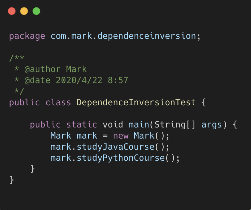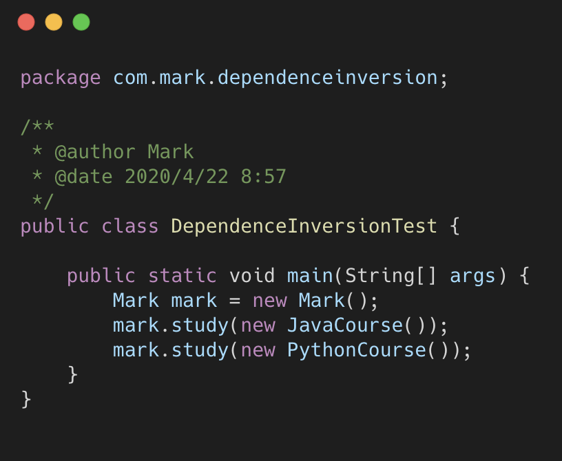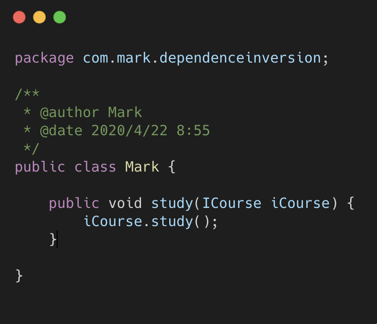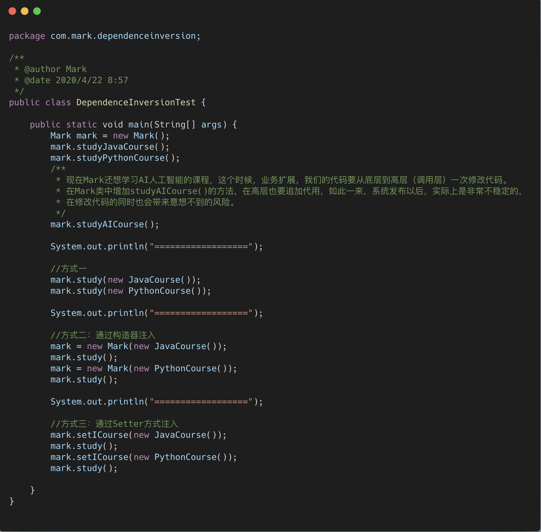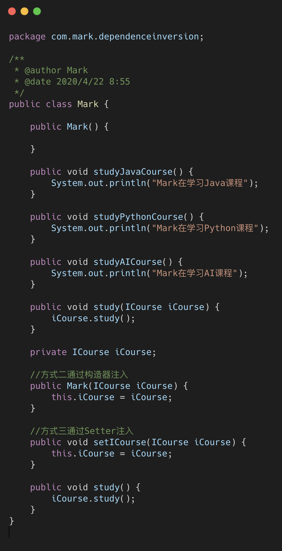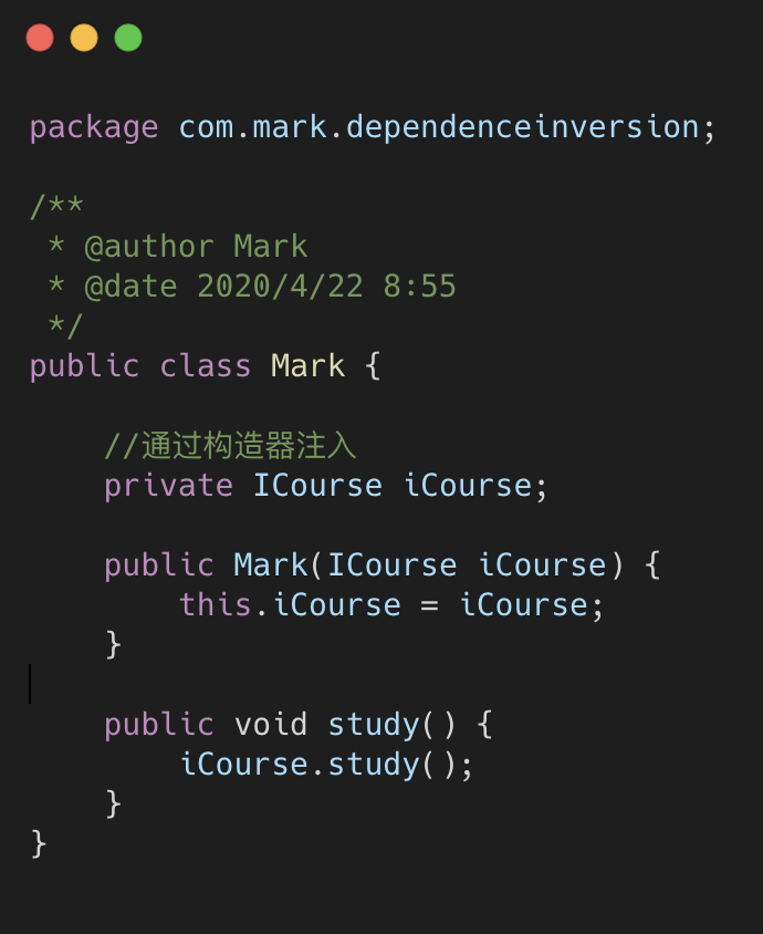 我们这时候再看来代码,Mark 的兴趣无论怎么暴涨,对于新的课程,我只需要新建一个类,通过传 参的方式告诉 Mark,而不需要修改底层代码。实际上这是一种大家非常熟悉的方式,叫依赖注入。注入 的方式还有构造器方式和 setter 方式。我们来看构造器注入方式: