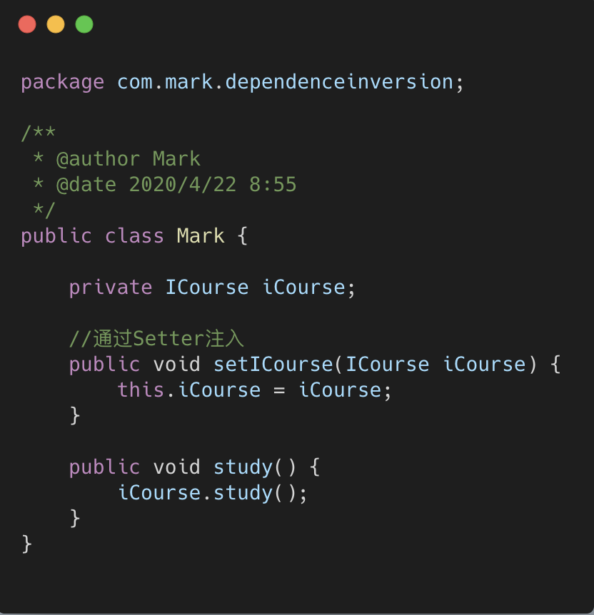 根据构造器方式注入,在调用时,每次都要创建实例。那么,如果 Mark 是全局单例,则我们就只能 选择用 Setter 方式来注入,继续修改 Mark 类的代码: