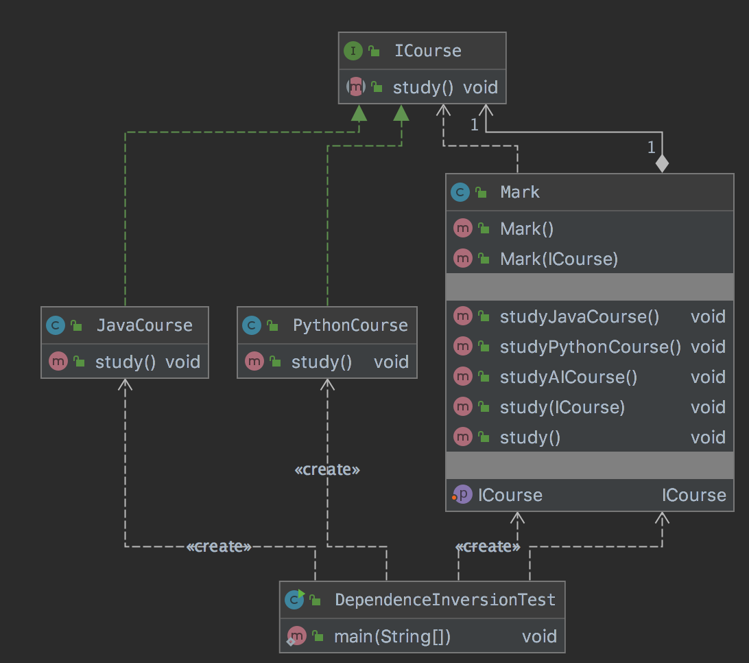 1.依赖倒置原则(Dependence Inversion Principle,DIP)是指设计代码结构时,高层模块不应该依 赖底层模块,二者都应该依赖其抽象。抽象不应该依赖细节;细节应该依赖抽象。通过依赖倒置,可以 减少类与类之间的耦合性,提高系统的稳定性,提高代码的可读性和可维护性,并能够降低修改程序所 造成的风险。接下来看一个案例,还是以课程为例,先来创建一个类 Mark: