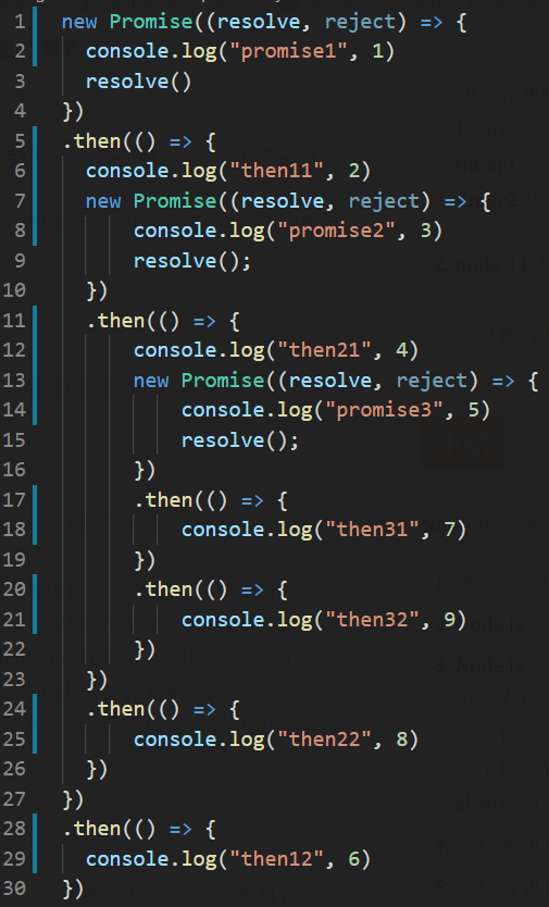 + console.log('script start')+ setTimeout(function() {+ console.log('setTimeout')+ }, 0)+ new Promise((resolve, reject)=>{+ console.log("promise1")+ resolve()+ })- .then(()=>{- console.log("then11")+ new Promise((resolve, reject)=>{+ console.log("promise2")+ resolve();+ })- .then(() => {- console.log("then2-1")- })- .then(() => {- console.log("then2-2")- })- })- .then(()=>{- console.log("then12")- })+ console.log('script end')