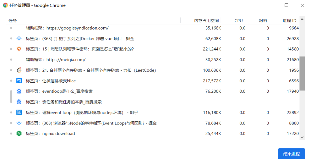 以 Chrome 来说,我们可以通过 Chrome 的任务管理器来看看。