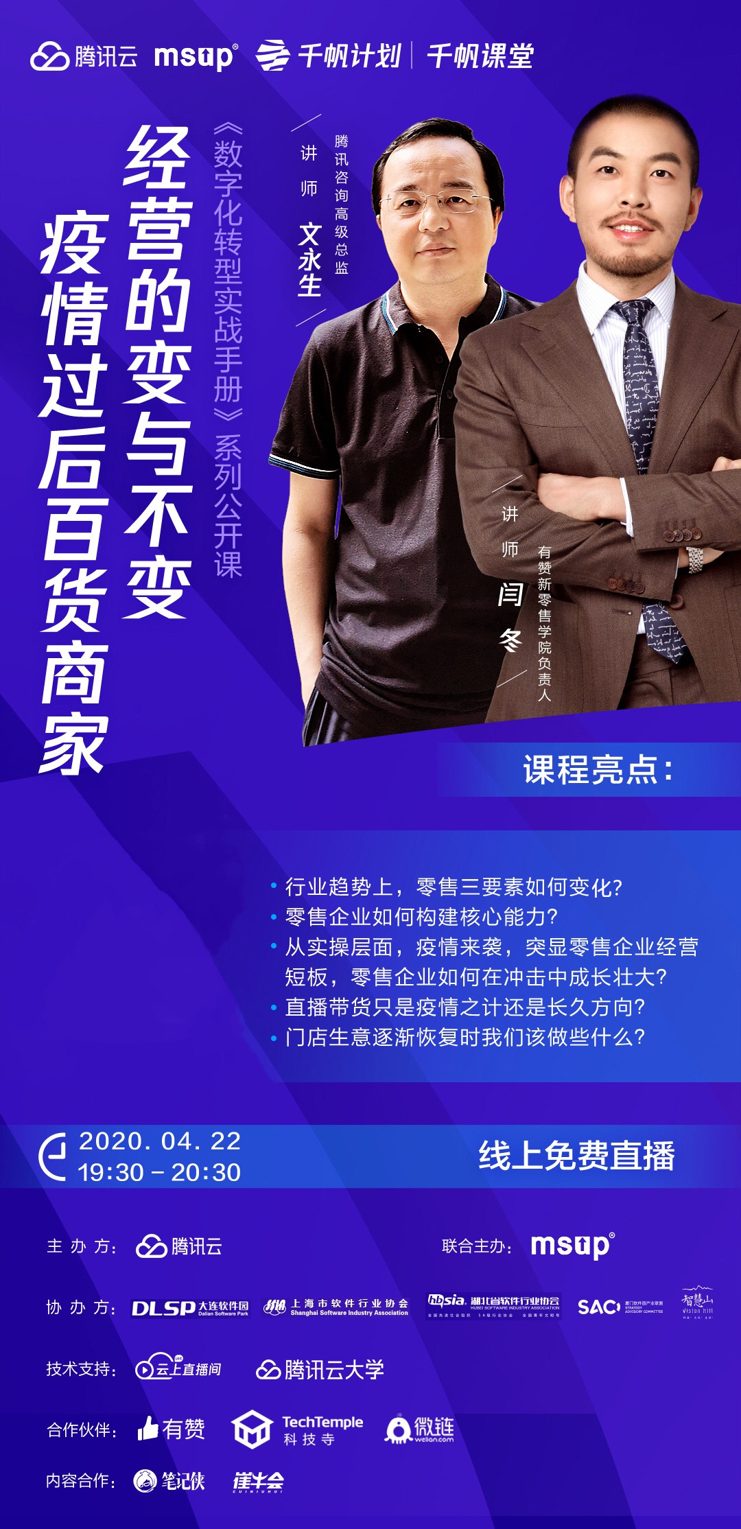 为了探寻究竟,我们邀请到了有赞新零售学院负责人闫冬、腾讯咨询高级总监文永生将于今晚与大家共同聚焦零售行业,分享如下话题: