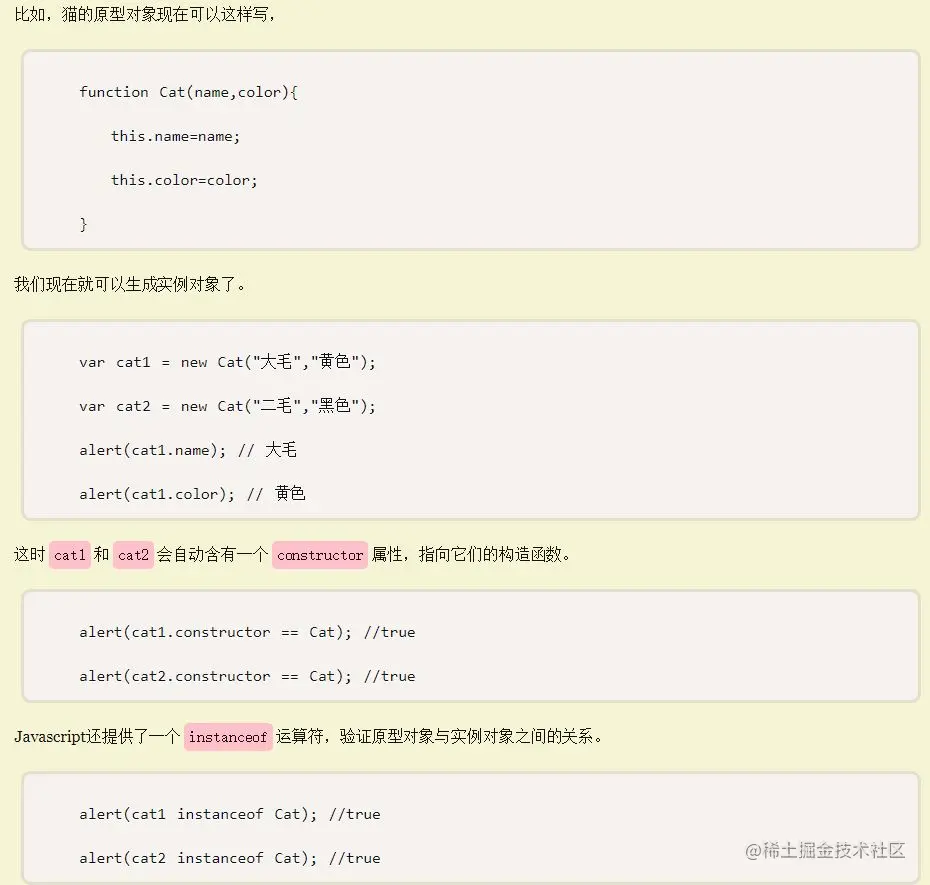 Cat.prototype.isPrototypeOf(cat2) // 检测cat2是不是在Cat的原型链上,返回值为布尔值