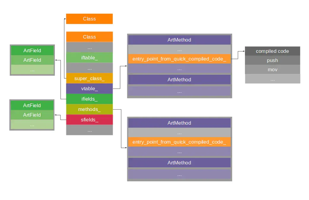 其中方法最终会指向 ArtMethod 实例上,属性,最终会指向 ArtField 实例上。