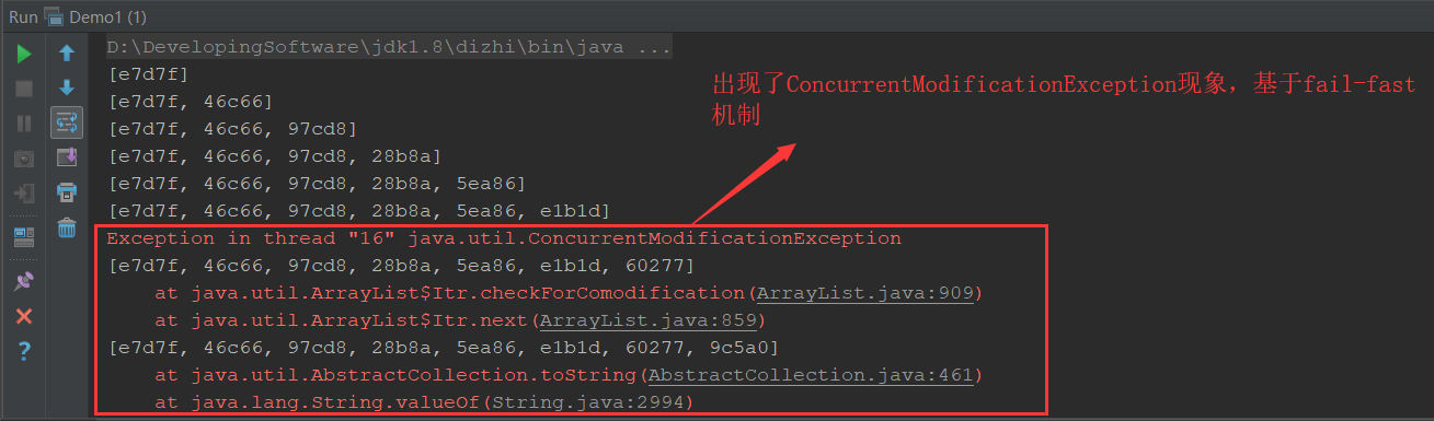 运行结果如下:由于fail-fast机制的存在,抛出了modcount修改异常的错误(modcount是ArrayList源码中的一个变量,用来表示修改的次数,因为ArrayList不是为并发情况而设计的集合类)