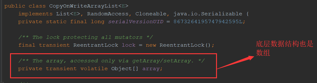 和ArrayList一样,其底层数据结构也是数组,加上transient不让其被序列化,加上volatile修饰来保证多线程下的其可见性和有序性