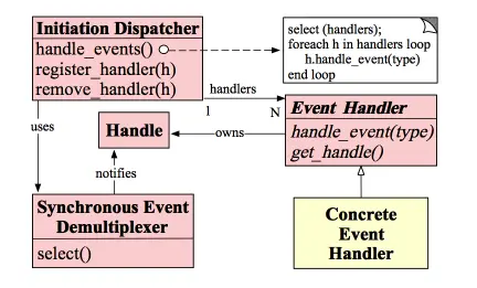 更学术的,这篇文章(Reactor An Object Behavioral Pattern for Demultiplexing and Dispatching Handles for Synchronous Events)上说:“The Reactor design pattern handles service requests that are delivered concurrently to an application by one or more clients. Each service in an application may consistent of several methods and is represented by a separate event handler that is responsible for dispatching service-specific requests. Dispatching of event handlers is performed by an initiation dispatcher, which manages the registered event handlers. Demultiplexing of service requests is performed by a synchronous event demultiplexer. Also known as Dispatcher, Notifier”。这段描述和Wikipedia上的描述类似,有多个输入源,有多个不同的EventHandler(RequestHandler)来处理不同的请求,Initiation Dispatcher用于管理EventHander,EventHandler首先要注册到Initiation Dispatcher中,然后Initiation Dispatcher根据输入的Event分发给注册的EventHandler;然而Initiation Dispatcher并不监听Event的到来,这个工作交给Synchronous Event Demultiplexer来处理。