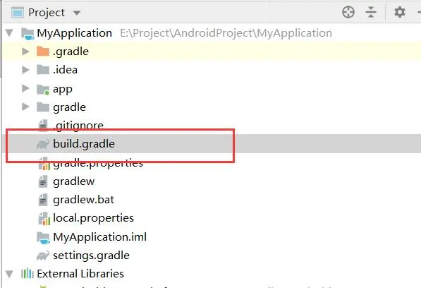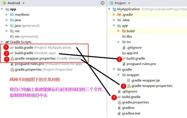 ①第一个文件 build.gradle(Project:MyApplication),将文件内容复制到 另一个项目 Project 视图,与app文件夹同一级的 build.gradle (可以先打开看一下,结构应该是一样的,就是 gradle的版本不同)