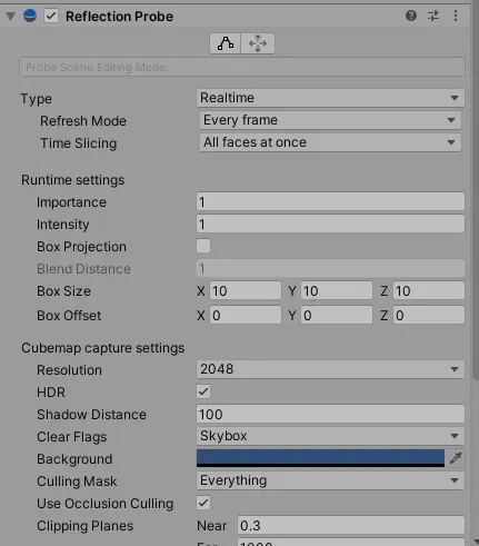 这里反射探头设置成实时(Realtime),Cubemap分辨率设置为2048: