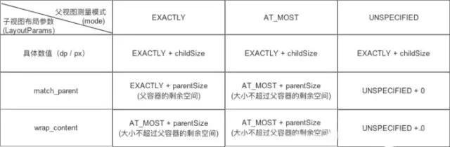 决定因素:值由子View的布局参数LayoutParams和父容器的MeasureSpec值共同决定。具体规则见下图: