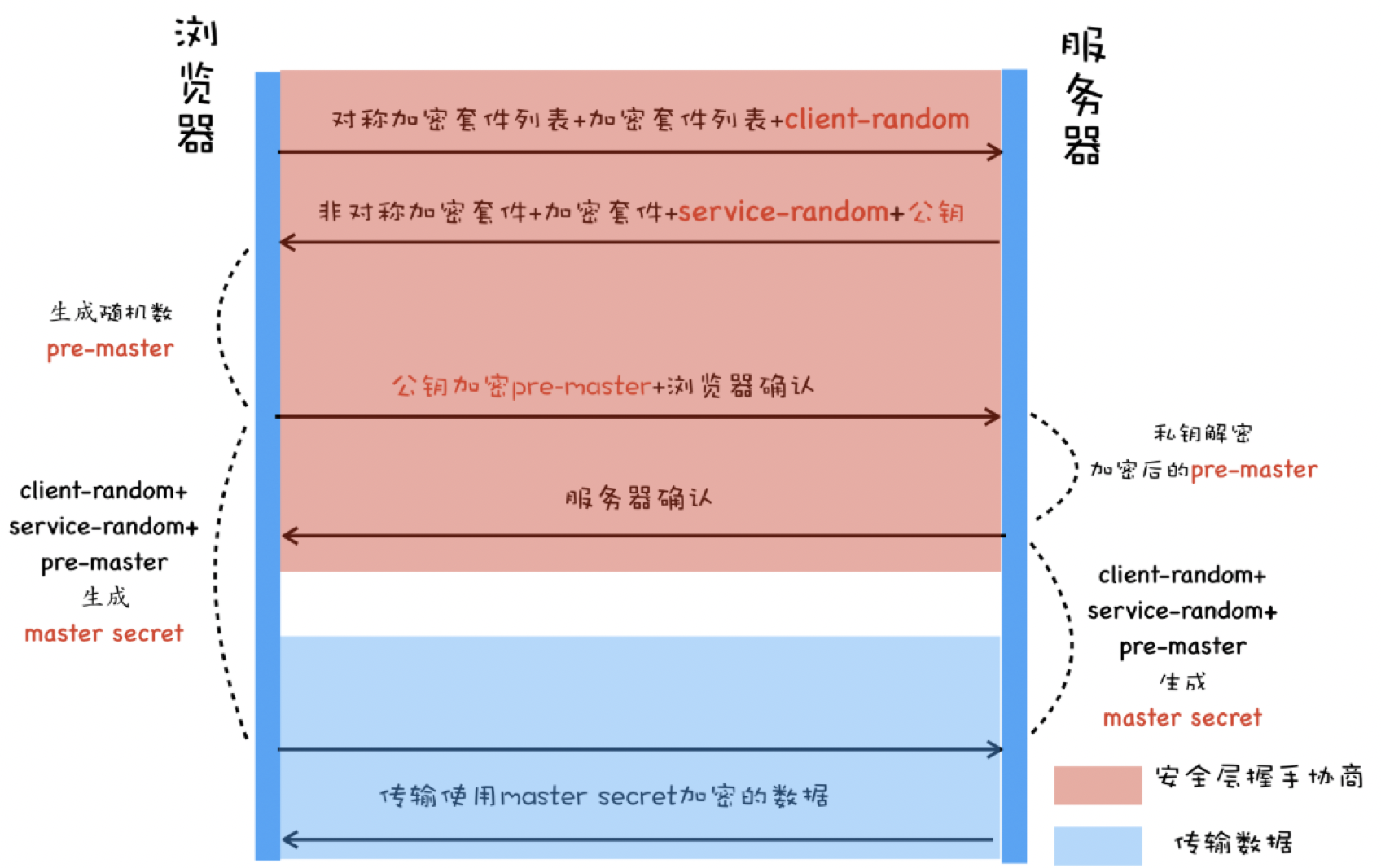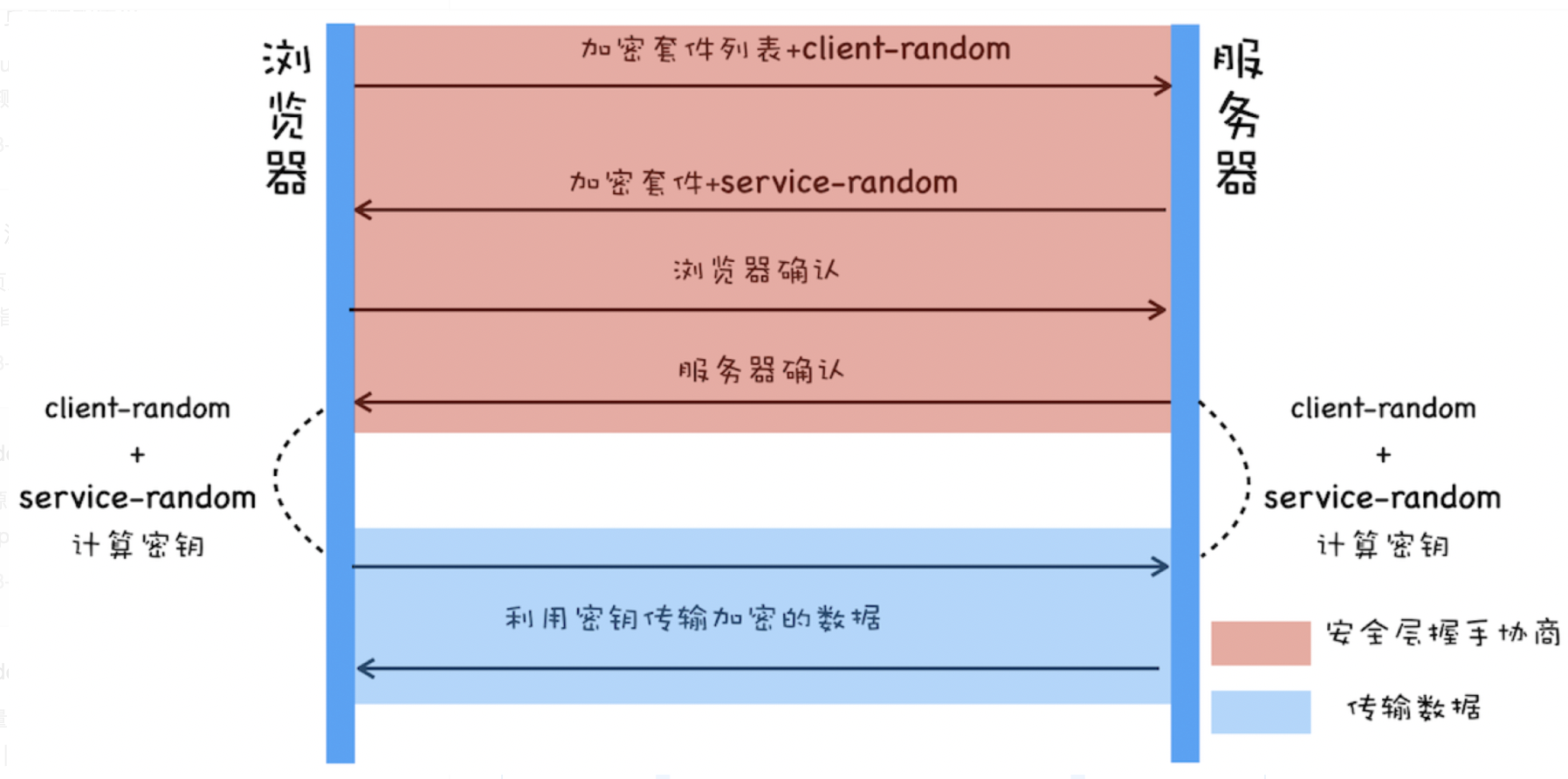 - 服务器会从加密套件列表中选取一个加密套件,然后还会生成一个随机数 service-random,并将 service-random 和加密套件列表返回给浏览器。